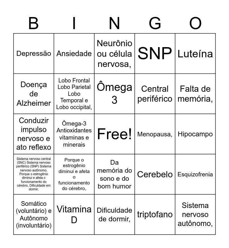 This bingo card has a free space and 26 words: Da memória do sono e do bom humor, triptofano, Ômega 3, Vitamina D, Luteína, Depressão, Doença de Alzheimer, Ansiedade, Hipocampo, Cerebelo, Central periférico, Conduzir impulso nervoso e ato reflexo, Esquizofrenia, Somático (voluntário) e Autônomo (involuntário), Ômega-3 Antioxidantes vitaminas e minerais, SNC, SNP, Sistema nervoso central (SNC) Sistema nervoso periférico (SNP) Sistema nervoso autônomo, Porque o estrogênio diminui e afeta o funcionamento do cérebro, Dificuldade em dormir,, Neurônio ou célula nervosa,, Sistema nervoso autônomo,, Falta de memória,, Dificuldade de dormir,, Menopausa,, Porque o estrogênio diminui e afeta o funcionamento do cérebro,, Lobo Frontal Lobo Parietal Lobo Temporal e Lobo occipital, and Central e Periférico..