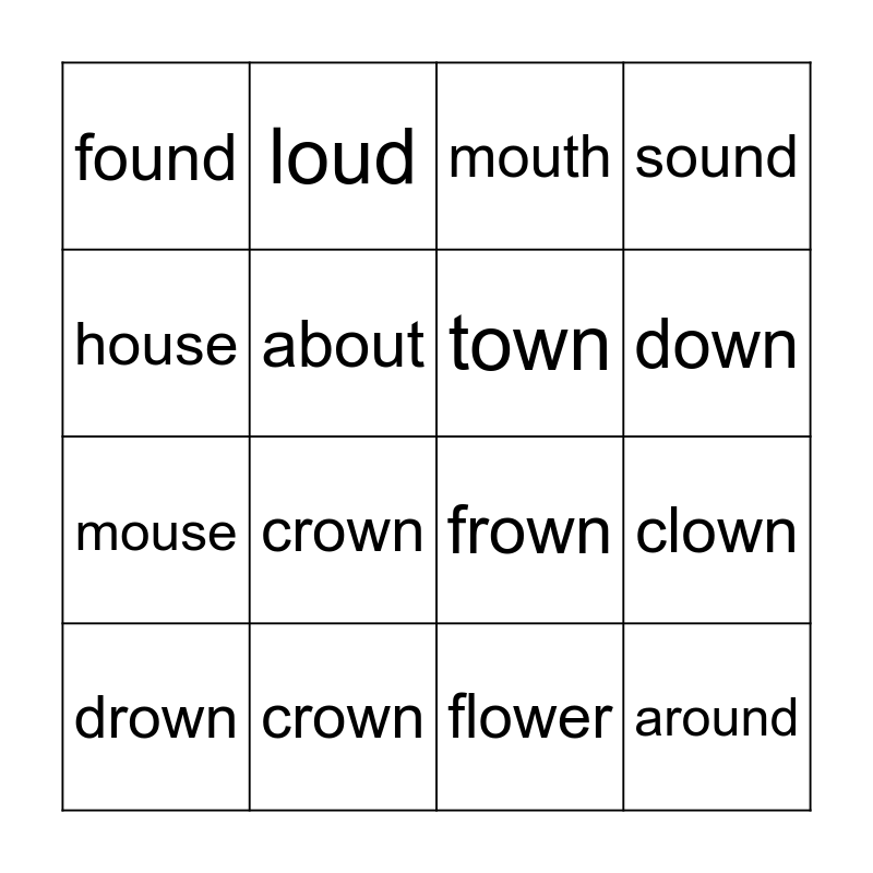 This bingo card has 18 words: crown, around, mouth, found, frown, sound, drown, loud, down, mouse, flower, house, clown, about, town, cloud, crown and mouth.