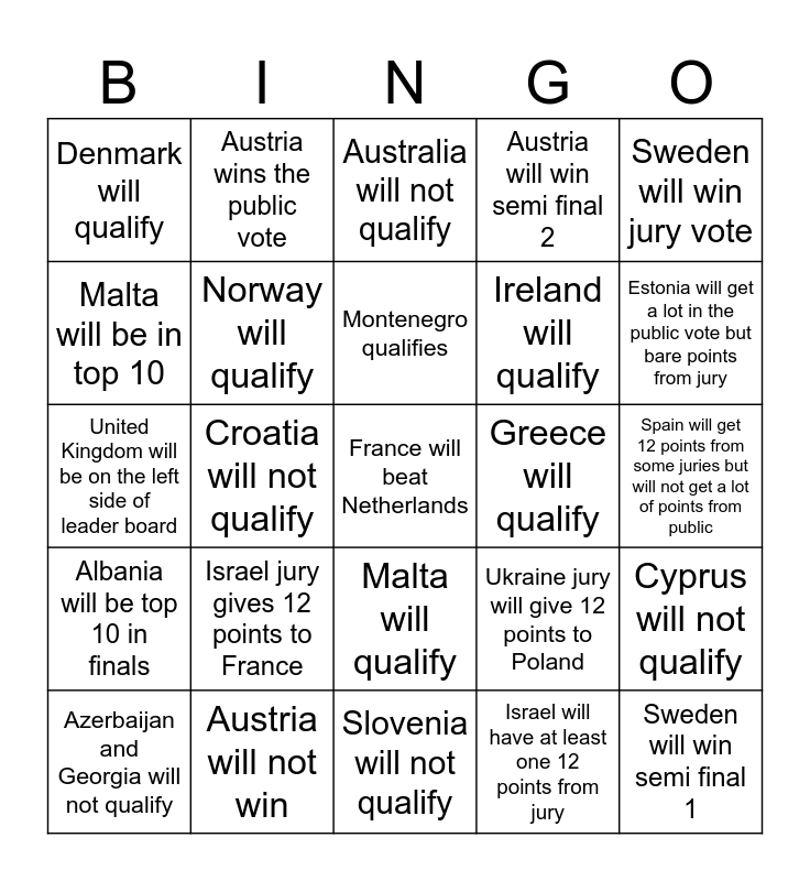 This bingo card has a free space and 24 words: Israel jury gives 12 points to France, Austria will not win, Montenegro qualifies, Azerbaijan and Georgia will not qualify, Sweden will win jury vote, Denmark will qualify, Malta will be in top 10, Austria wins the public vote, Greece will qualify, Malta will qualify, Ireland will qualify, United Kingdom will be on the left side of leader board, Ukraine jury will give 12 points to Poland, Cyprus will not qualify, Norway will qualify, Israel will have at least one 12 points from jury, Spain will get 12 points from some juries but will not get a lot of points from public, Australia will not qualify, Estonia will get a lot in the public vote but bare points from jury, Croatia will not qualify, Sweden will win semi final 1, Albania will be top 10 in finals, Austria will win semi final 2 and Slovenia will not qualify.