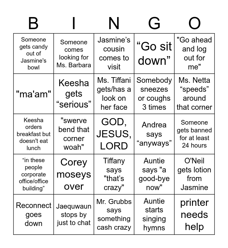 This bingo card has a free space and 24 words: Corey moseys over, Jaequwaun stops by just to chat, Ms. Tiffani gets/has a look on her face, Reconnect goes down, "Go ahead and log out for me", Someone gets candy out of Jasmine's bowl, "ma'am", Someone comes looking for Ms. Barbara, Andrea says “anyways”, Tiffany says "that’s crazy", Somebody sneezes or coughs 3 times, Keesha orders breakfast but doesn't eat lunch, Auntie says "a good-bye now", O'Neil gets lotion from Jasmine, Keesha gets “serious”, Auntie starts singing hymns, Someone gets banned for at least 24 hours, Jasmine’s cousin comes to visit, Ms. Netta “speeds” around that corner, "swerve bend that corner woah", printer needs help, “in these people corporate office/office building”, “Go sit down” and Mr. Grubbs says something cash crazy.