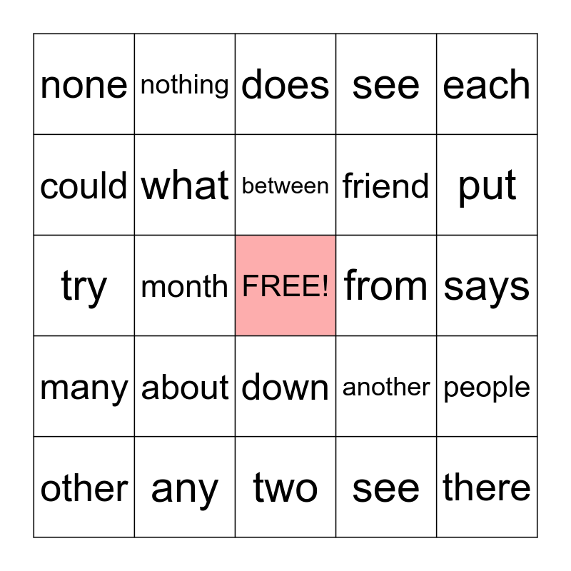 This bingo card has a free space and 25 words: about, two, between, other, each, none, could, nothing, from, down, friend, try, another, people, what, come, says, does, put, month, there, any, many, see and see.