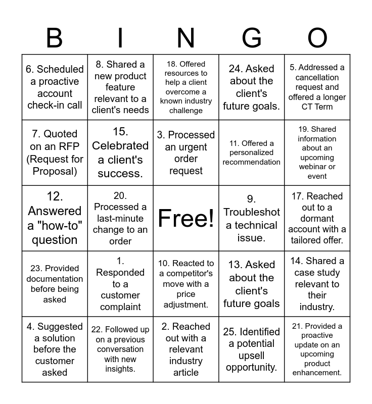 This bingo card has a free space and 25 words: 1. Responded to a customer complaint, 2. Reached out with a relevant industry article, 3. Processed an urgent order request, 4. Suggested a solution before the customer asked, 5. Addressed a cancellation request and offered a longer CT Term, 6. Scheduled a proactive account check-in call, 7. Quoted on an RFP (Request for Proposal), 8. Shared a new product feature relevant to a client's needs, 9. Troubleshot a technical issue., 10. Reacted to a competitor's move with a price adjustment., 11. Offered a personalized recommendation, 12. Answered a "how-to" question, 13. Asked about the client's future goals, 14. Shared a case study relevant to their industry., 15. Celebrated a client's success., 16. Offered to help with a challenge the client mentioned, 17. Reached out to a dormant account with a tailored offer., 18. Offered resources to help a client overcome a known industry challenge, 19. Shared information about an upcoming webinar or event, 20. Processed a last-minute change to an order, 21. Provided a proactive update on an upcoming product enhancement., 22. Followed up on a previous conversation with new insights., 23. Provided documentation before being asked, 24. Asked about the client's future goals. and 25. Identified a potential upsell opportunity..