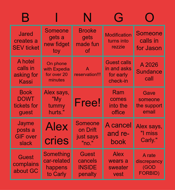This bingo card has a free space and 24 words: Alex cries, Something car-related happens to Carly, A reservation!!!, Guest complains about GC, Someone calls in for Jason, Jared creates a SEV ticket, A hotel calls in asking for Kassi, Someone gets a new fidget toy, Ram comes into the office, Someone on Drift just says "no.", Guest calls in and asks for early check-in, Book DOWT tickets for guest, A cancel and re-book, Alex says, "I miss Carly.", On phone with Expedia for over 20 minutes, Alex wears a sweater vest, Gave someone the support email, Brooke gets made fun of, A 2026 Sundance call, Alex says, "My tummy hurts.", A rate discrepancy (GOD FORBID), Jayme posts a GIF over slack, Modification turns into rezzie and Guest cancels INSIDE penalty.