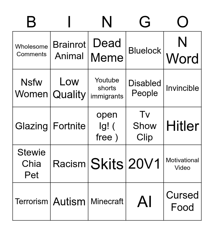 This bingo card has a free space and 24 words: Racism, Autism, Youtube shorts immigrants, Terrorism, N Word, Wholesome Comments, Nsfw Women, Brainrot Animal, Tv Show Clip, Skits, Disabled People, Glazing, 20V1, Motivational Video, Low Quality, AI, Hitler, Dead Meme, Invincible, Fortnite, Cursed Food, Stewie Chia Pet, Bluelock and Minecraft.