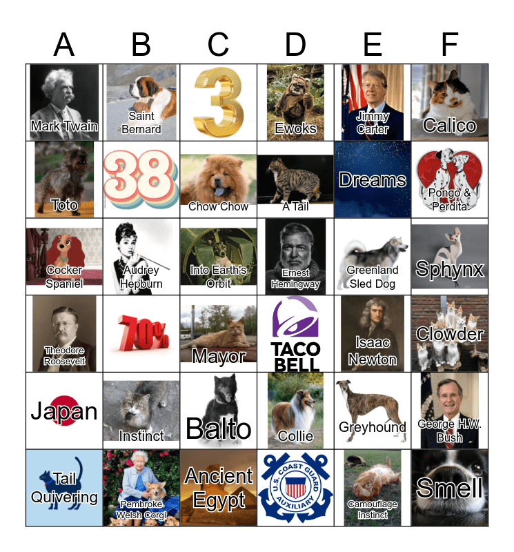 This bingo card has 36 images and 31 words: Collie, Balto, Toto, Theodore Roosevelt, Ernest Hemingway, Ancient Egypt, Jimmy Carter, Greyhound, Pongo & Perdita, Ewoks, George H.W. Bush, Audrey Hepburn, A Tail, Mark Twain, Japan, Greenland Sled Dog, Cocker Spaniel, Into Earth's Orbit, Mayor, Isaac Newton, Saint Bernard, Dreams, Pembroke Welsh Corgi, Chow Chow, Calico, Smell, Tail Quivering, Clowder, Sphynx, Instinct and Camouflage Instinct.