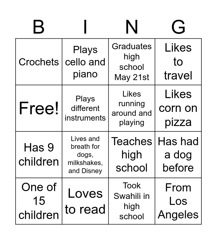 This bingo card has 16 words: Loves to read, Has had a dog before, Graduates high school May 21st, Crochets, Has 9 children, Plays cello and piano, Teaches high school, Took Swahili in high school, Free!, Plays different instruments, One of 15 children, Likes to travel, Lives and breath for dogs, milkshakes, and Disney, Likes corn on pizza, Likes running around and playing and From Los Angeles.