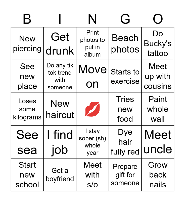 This bingo card has a free space and 24 words: I find job, Get a boyfriend, Move on, Start new school, Do Bucky's tattoo, New piercing, See new place, Get drunk, Tries new food, I stay sober (sh) whole year, Starts to exercise, Loses some kilograms, Dye hair fully red, Meet uncle, Do any tik tok trend with someone, Prepare gift for someone, Paint whole wall, Print photos to put in album, Meet up with cousins, New haircut, Grow back nails, See sea, Beach photos and Meet with s/o.