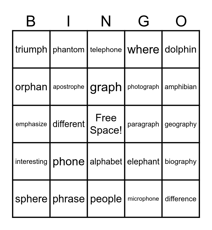 This bingo card has a free space and 24 words: phone, phrase, graph, sphere, dolphin, triumph, orphan, phantom, paragraph, alphabet, photograph, emphasize, elephant, biography, apostrophe, microphone, geography, telephone, amphibian, different, difference, interesting, where and people.