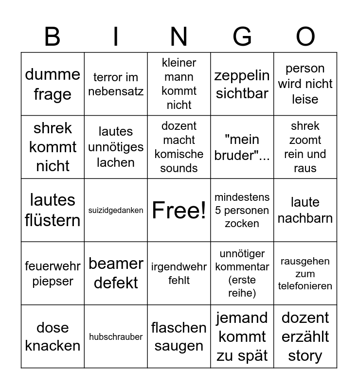 This bingo card has a free space and 28 words: rausgehen zum telefonieren, erste reihe lacht, "mein bruder"..., jemand kommt zu spät, shrek kommt nicht, kleiner mann kommt nicht, terror im nebensatz, feuerwehr piepser, mindestens 5 personen zocken, dose knacken, lautes flüstern, zeppelin sichtbar, hubschrauber, flaschen saugen, shrek zoomt rein und raus, dozent kommt zu spät, beamer defekt, lautes unnötiges lachen, dozent macht komische sounds, irgendwehr fehlt, dumme frage, inhalt wiederholt sich, dozent erzählt story, suizidgedanken, laute nachbarn, unnötiger kommentar (erste reihe), person wird nicht leise and niesen.