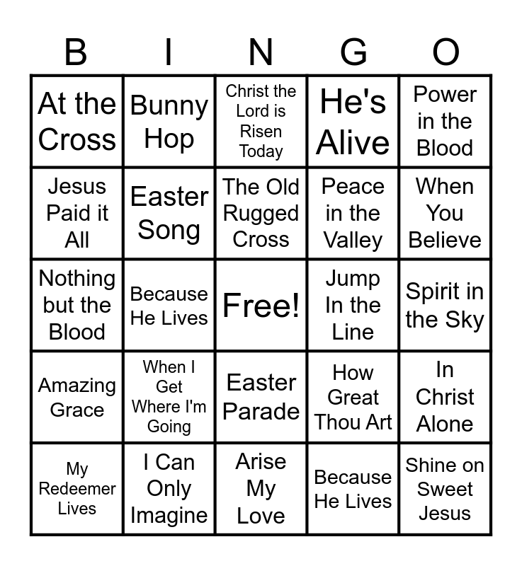 This bingo card has a free space and 24 words: When I Get Where I'm Going, I Can Only Imagine, The Old Rugged Cross, My Redeemer Lives, Power in the Blood, At the Cross, Jesus Paid it All, Bunny Hop, Jump In the Line, Easter Parade, Peace in the Valley, Nothing but the Blood, How Great Thou Art, In Christ Alone, Easter Song, Because He Lives, Spirit in the Sky, Christ the Lord is Risen Today, When You Believe, Because He Lives, Shine on Sweet Jesus, Amazing Grace, He's Alive and Arise My Love.