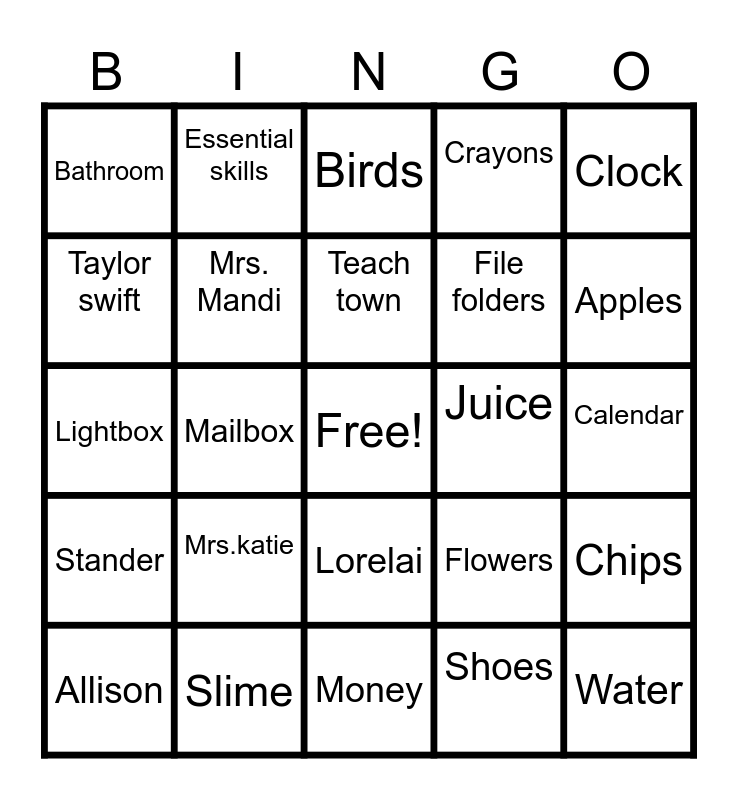 This bingo card has a free space and 24 words: Mrs.katie, Slime, Teach town, Allison, Clock, Bathroom, Taylor swift, Essential skills, Juice, Lorelai, File folders, Lightbox, Flowers, Chips, Mrs. Mandi, Shoes, Calendar, Birds, Apples, Mailbox, Water, Stander, Crayons and Money.