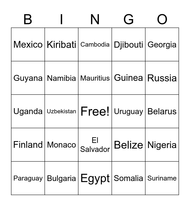 This bingo card has a free space and 193 words: Afghanistan, Albania, Algeria, Andorra, Angola, Argentina, Armenia, Australia, Austria, Azerbaijan, Bahamas, Bahrain, Bangladesh, Barbados, Belarus, Belgium, Belize, Benin, Bhutan, Bolivia, Bosnia and Herzegovina, Botswana, Brazil, Brunei, Bulgaria, Burkina Faso, Burundi, Cabo Verde, Cambodia, Cameroon, Canada, Central African Republic, Chad, Chile, China, Colombia, Comoros, Congo (Congo-Brazzaville), Costa Rica, Croatia, Cuba, Cyprus, Czech Republic (Czechia), Democratic Republic of the Congo, Denmark, Djibouti, Dominica, Dominican Republic, Ecuador, Egypt, El Salvador, Equatorial Guinea, Eritrea, Estonia, Eswatini, Ethiopia, Fiji, Finland, France, Gabon, Gambia, Georgia, Germany, Ghana, Greece, Grenada, Guatemala, Guinea, Guinea-Bissau, Guyana, Haiti, Honduras, Hungary, Iceland, India, Indonesia, Iran, Iraq, Ireland, Israel, Italy, Ivory Coast (Côte d'Ivoire), Jamaica, Japan, Jordan, Kazakhstan, Kenya, Kiribati, Kuwait, Kyrgyzstan, Laos, Latvia, Lebanon, Lesotho, Liberia, Libya, Liechtenstein, Lithuania, Luxembourg, Madagascar, Malawi, Malaysia, Maldives, Mali, Malta, Marshall Islands, Mauritania, Mauritius, Mexico, Micronesia, Moldova, Monaco, Mongolia, Montenegro, Morocco, Mozambique, Myanmar, Namibia, Nauru, Nepal, Netherlands, New Zealand, Nicaragua, Niger, Nigeria, North Korea, North Macedonia, Norway, Oman, Pakistan, Palau, Panama, Papua New Guinea, Paraguay, Peru, Philippines, Poland, Portugal, Qatar, Romania, Russia, Rwanda, Saint Kitts and Nevis, Saint Lucia, Saint Vincent and the Grenadines, Samoa, San Marino, Sao Tome and Principe, Saudi Arabia, Senegal, Serbia, Seychelles, Sierra Leone, Singapore, Slovakia, Slovenia, Solomon Islands, Somalia, South Africa, South Korea, South Sudan, Spain, Sri Lanka, Sudan, Suriname, Sweden, Switzerland, Syria, Tajikistan, Tanzania, Thailand, Timor-Leste, Togo, Tonga, Trinidad and Tobago, Tunisia, Turkey, Turkmenistan, Tuvalu, Uganda, Ukraine, United Arab Emirates, United Kingdom, United States, Uruguay, Uzbekistan, Vanuatu, Vatican City, Venezuela, Vietnam, Yemen, Zambia and Zimbabwe.