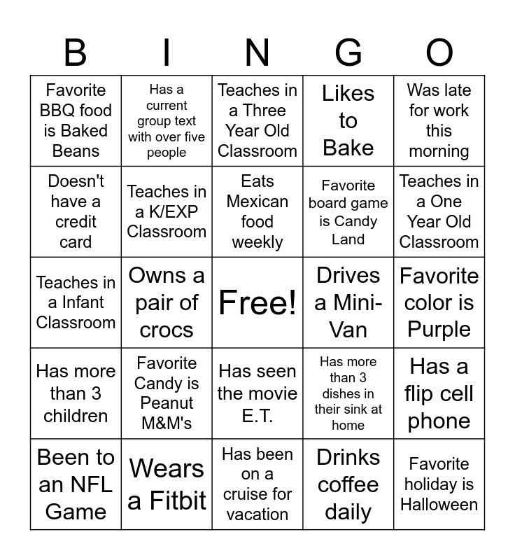 This bingo card has a free space and 34 words: Been to a concert in the past year, Drinks coffee daily, Teaches in a PreK Classroom, Is the Mom of a fur baby, Has more than 3 children, Teaches in a K/EXP Classroom, Was late for work this morning, Been to an NFL Game, Has a current group text with over five people, Is from the Texas area, Eats Mexican food weekly, Teaches in a Three Year Old Classroom, Favorite dessert is Chocolate Icecream, Prefers Winter over Summer, Drives a Mini-Van, Teaches in a One Year Old Classroom, Wears a Fitbit, Teaches in a Infant Classroom, Favorite Candy is Peanut M&M's, Has more than 3 dishes in their sink at home, Has seen the movie E.T., Has never tried Boba, Favorite BBQ food is Baked Beans, Favorite color is Purple, Has been on a cruise for vacation, Favorite holiday is Halloween, Likes to Bake, Has never been to the ocean, Favorite board game is Candy Land, Doesn't have a credit card, Favorite fruit is Mango, Owns a pair of crocs, Has a flip cell phone and Favorite store is Trader Joe's.