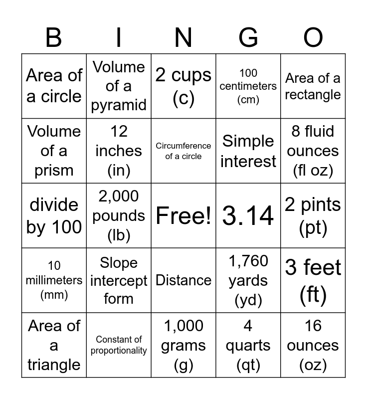 This bingo card has a free space and 24 words: Slope intercept form, Constant of proportionality, Circumference of a circle, Area of a triangle, Area of a rectangle, Area of a circle, Volume of a prism, Volume of a pyramid, 3.14, Distance, Simple interest, divide by 100, 1,760 yards (yd), 3 feet (ft), 12 inches (in), 4 quarts (qt), 2 pints (pt), 2 cups (c), 8 fluid ounces (fl oz), 2,000 pounds (lb), 16 ounces (oz), 10 millimeters (mm), 100 centimeters (cm) and 1,000 grams (g).