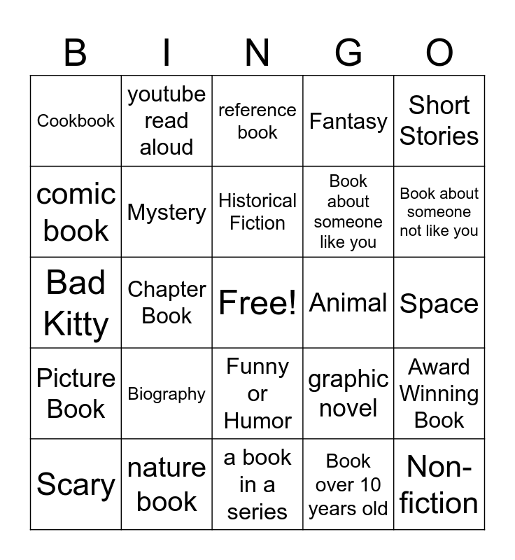 This bingo card has a free space and 39 words: Eric Carle, Dr. Seuss, Mo Willems, Mystery, Scary, Funny or Humor, Historical Fiction, Science Fiction, Short Stories, Picture Book, Chapter Book, Fantasy, Non-fiction, Space, Animal, Biography, Realistic Fiction, Cookbook, Craft Book, graphic novel, comic book, a book in a series, Book about someone like you, Book about someone not like you, Hardcover, Paperback, Who Would Win Book, e-book, audiobook, youtube read aloud, podcast, history book, reference book, nature book, Book over 10 years old, Book under 2 years old, Award Winning Book, Bad Kitty and Illustrated novel.