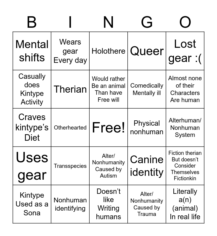 This bingo card has a free space and 24 words: Transspecies, Nonhuman identifying, Would rather Be an animal Than have Free will, Kintype Used as a Sona, Lost gear :(, Mental shifts, Casually does Kintype Activity, Wears gear Every day, Physical nonhuman, Alter/ Nonhumanity Caused by Autism, Comedically Mentally ill, Craves kintype’s Diet, Canine identity, Fiction therian But doesn’t Consider Themselves Fictionkin, Therian, Alter/ Nonhumanity Caused by Trauma, Alterhuman/ Nonhuman System, Holothere, Almost none of their Characters Are human, Otherhearted, Literally a(n) (animal) In real life, Uses gear, Queer and Doesn’t like Writing humans.