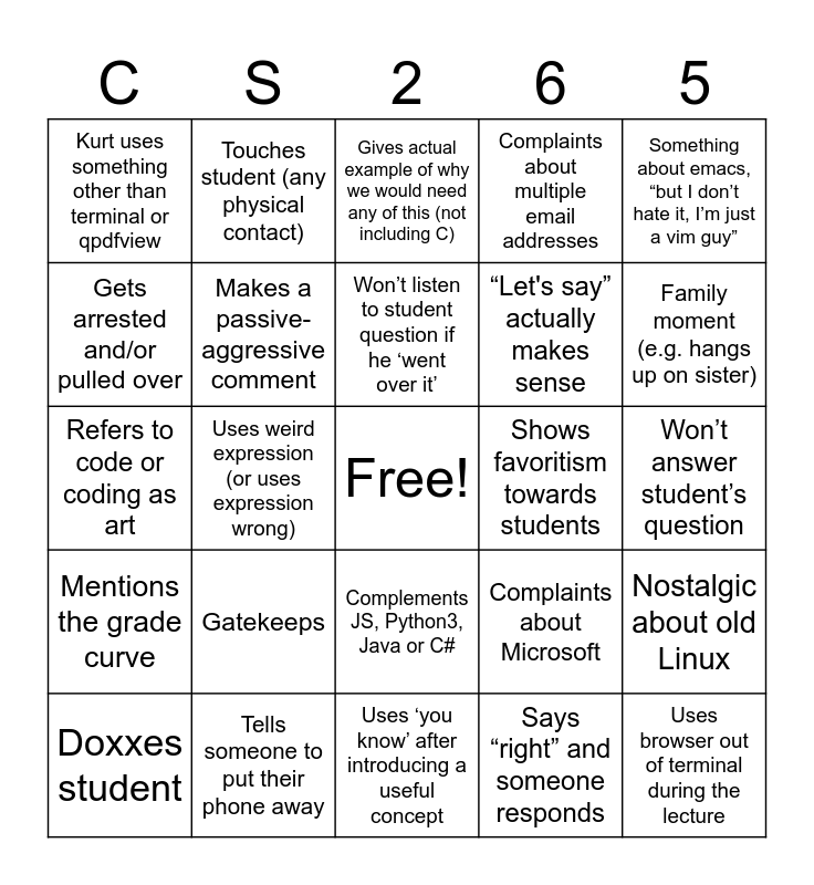 This bingo card has a free space and 50 words: Complaining about OOP language, Uses browser out of terminal during the lecture, Ends rant with variation of ‘come on guys, we’re better than this’, Uses ‘you know’ after introducing a useful concept, Gatekeeps, Mentions boats, Touches student (any physical contact), Goes on an anarchist rant, Gets arrested and/or pulled over, Tries to bring down the Tux server, Makes a passive-aggressive comment, Complaints about multiple email addresses, Nostalgic about old Linux, Complaints about Microsoft, Talks about personal life more than the topic, Says “you should know this” when we don’t have a reason to, Won’t listen to student question if he ‘went over it’, Shows favoritism towards students, Misogyny, Something about emacs, “but I don’t hate it, I’m just a vim guy”, Uses weird expression (or uses expression wrong), Says “right” and someone responds, Kurt uses something other than terminal or qpdfview, “Let's say” actually makes sense, Bullies someone, References a relevant modern-day program tool (e.g. Pandas), Family moment (e.g. hangs up on sister), Forgets terminal command, Gives actual example of why we would need any of this (not including C), Complements JS, Python3, Java or C#, Checks the man page (the guy does that, not you), Walks in at least 5 minutes late, Brings up thing we don’t know that will (probably) never come up again, Tells story with no clear moral or conclusion, Tells someone to put their phone away, Uses the word “elegant” unironically about any Kurt language, Flexes about using email through mutt, Calls vim magical, the best, etc, Uses multiple terminals at once, Won’t answer student’s question, “We went over that” in response to question (he did not), Disses arrow keys and or mouse, Mentions pornography (again), Mutters “it shouldn’t do that”, Doxxes student, Refers to code or coding as art, Actually goes over something before quiz, Says we should know something, but hasn’t been in any lecture, Mentions the grade curve and Calls functional languages superior (never uses them).
