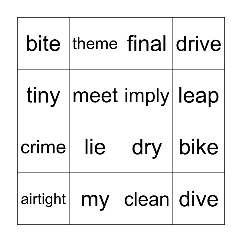 This bingo card has 65 words: team, funny, athlete, sheep, dream, daisy, theme, keep, leap, berry, compete, free, clean, tiny, delete, meet, bike, bite, bride, crime, dime, dive, drive, file, fine, fire, five, glide, airtight, bright, candlelight, delight, fight, flight, foresight, fortnight, deny, dry, fly, fry, imply, magnify, my, rely, fried, justified, lie, pie, relied, replied, spied, supplied, terrified, tie, tried, untied, bicycle, final, finally, Friday, giant, hi, idea, iron and item.
