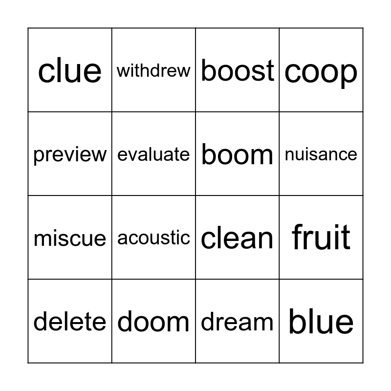 This bingo card has 171 words: team, funny, athlete, sheep, dream, daisy, theme, keep, leap, berry, compete, free, clean, tiny, delete, meet, acute, amuse, attribute, commute, compute, cube, cute, excuse, fuse, immune, mute, refuse, tribute, use, volume, absolute, altitude, attitude, chute, crude, flute, include, June, neptune, parachute, prune, rule, salute, truce, tune, argue, barbecue, continue, cue, imbue, issue, miscue, rescue, statue, tissue, value, venue, accrue, avenue, blue, clue, due, glue, pursue, residue, revenue, subdue, sue, true, few, interview, preview, review, skew, view, brew, chew, crew, drew, flew, grew, mildew, new, renew, screw, stew, threw, withdrew, aloof, bamboo, bloom, boom, boot, boost, broom, cartoon, cool, coop, doom, droop, food, fool, goo, goofy, goose, hoop, igloo, loop, mood, moon, moose, noon, oops, ooze, proof, roof, scoop, shoot, soon, stoop, too, zoo, acoustic, goulash, group, mousse, routine, soup, through, troupe, wound, youth, fruit, suit, juice, cruise, bruise, nuisance, recruit, suitable, annual, computer, cuba, cubic, cupid, duty, emu, evaluate, fuel, futile, future, genuine, humane, human, humid, humor, menu, manual, museum, music, mutate, mutual, puny, pupil, unicorn, uniform, unique, unit, unity and usual.