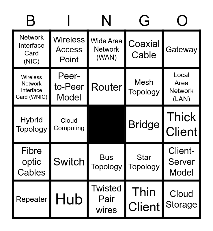 This bingo card has a free space and 24 words: Switch, Hub, Router, Repeater, Gateway, Network Interface Card (NIC), Wireless Network Interface Card (WNIC), Wireless Access Point, Bridge, Bus Topology, Mesh Topology, Hybrid Topology, Star Topology, Client-Server Model, Peer-to-Peer Model, Thin Client, Thick Client, Wide Area Network (WAN), Local Area Network (LAN), Cloud Computing, Cloud Storage, Fibre optic Cables, Coaxial Cable and Twisted Pair wires.