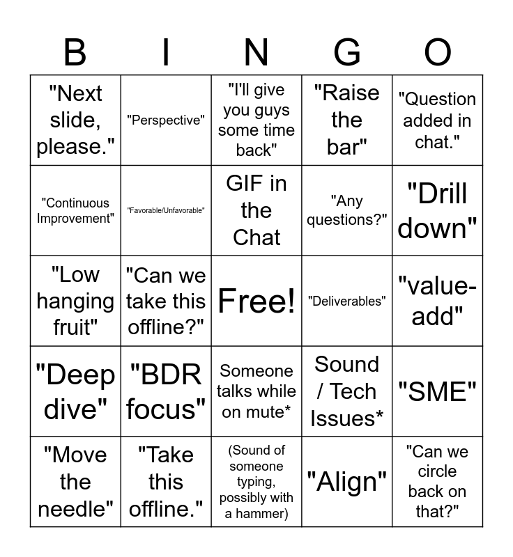 This bingo card has a free space and 31 words: (Sound of someone typing, possibly with a hammer), (Loud painful echo/computer feedback), "Can we take this offline?", "Can everyone see my screen?", "Next slide, please.", "I'll give you guys some time back", "Favorable/Unfavorable", Sound / Tech Issues*, "Deliverables", "Align", "value-add", "Can we circle back on that?", "KPI", "Leverage", "Drill down", "Keep me in the loop", "SME", "BDR focus", "Deep dive", Someone talks while on mute*, "Question added in chat.", "Bandwidth", "Move the needle", "Perspective", "Any questions?", "Continuous Improvement", "Raise the bar", "Low hanging fruit", "Take this offline.", GIF in the Chat and "Can everyone see my screen?".