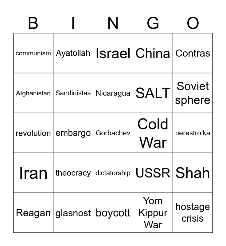 This bingo card has 32 words: Yom Kippur War, sanctions, embargo, OPEC, Iran, Sandinistas, Contras, Shah, Ayatollah, hostage crisis, Nicaragua, Israel, Energy Crisis, Sinai Peninsula, Cold War, Carter, Reagan, revolution, dictatorship, theocracy, USSR, detente, perestroika, glasnost, Gorbachev, China, SALT, Afghanistan, communism, boycott, SDI and Soviet sphere.