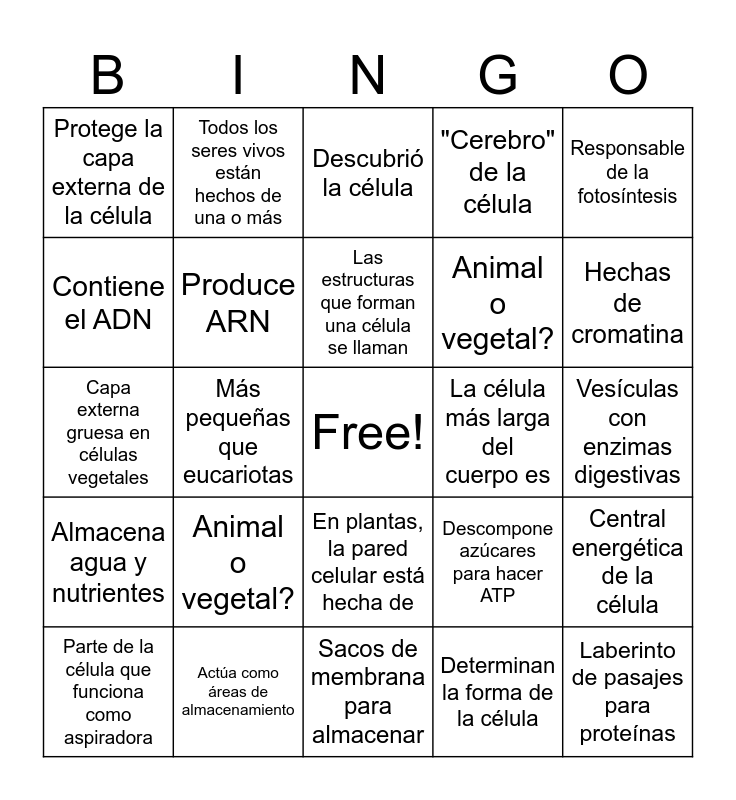 This bingo card has a free space and 24 words: Animal o vegetal?, Actúa como áreas de almacenamiento, Las estructuras que forman una célula se llaman, Parte de la célula que funciona como aspiradora, Responsable de la fotosíntesis, Protege la capa externa de la célula, Contiene el ADN, Todos los seres vivos están hechos de una o más, La célula más larga del cuerpo es, En plantas, la pared celular está hecha de, Animal o vegetal?, Capa externa gruesa en células vegetales, Descompone azúcares para hacer ATP, Central energética de la célula, Produce ARN, Determinan la forma de la célula, Vesículas con enzimas digestivas, Descubrió la célula, Hechas de cromatina, Más pequeñas que eucariotas, Laberinto de pasajes para proteínas, Almacena agua y nutrientes, "Cerebro" de la célula and Sacos de membrana para almacenar.