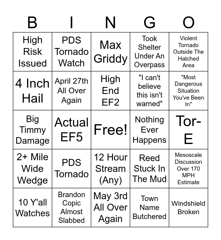 This bingo card has a free space and 24 words: PDS Tornado, Brandon Copic Almost Slabbed, High End EF2, 10 Y'all Watches, Violent Tornado Outside The Hatched Area, High Risk Issued, 4 Inch Hail, PDS Tornado Watch, Nothing Ever Happens, 12 Hour Stream (Any), "I can't believe this isn't warned", Big Timmy Damage, Reed Stuck In The Mud, Mesoscale Discussion Over 170 MPH Estimate, April 27th All Over Again, Town Name Butchered, Tor-E, Max Griddy, "Most Dangerous Situation You've Been In", Actual EF5, Windshield Broken, 2+ Mile Wide Wedge, Took Shelter Under An Overpass and May 3rd All Over Again.