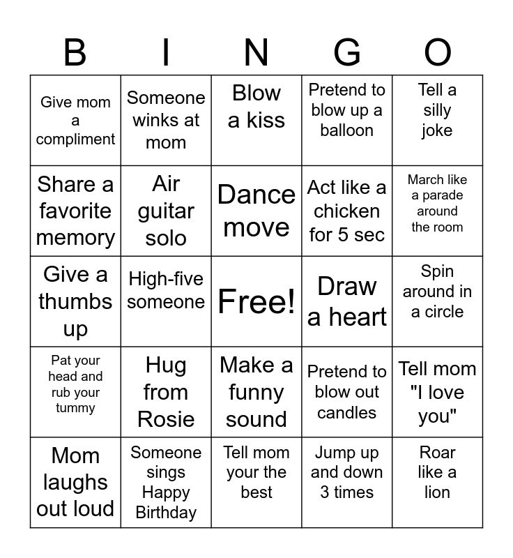 This bingo card has a free space and 24 words: Hug from Rosie, Someone sings Happy Birthday, Dance move, Mom laughs out loud, Tell a silly joke, Give mom a compliment, Share a favorite memory, Someone winks at mom, Draw a heart, Make a funny sound, Act like a chicken for 5 sec, Give a thumbs up, Pretend to blow out candles, Tell mom "I love you", Air guitar solo, Jump up and down 3 times, Spin around in a circle, Blow a kiss, March like a parade around the room, High-five someone, Roar like a lion, Pat your head and rub your tummy, Pretend to blow up a balloon and Tell mom your the best.