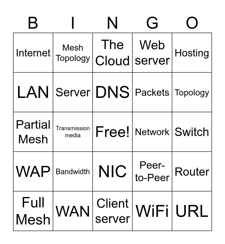 This bingo card has a free space and 25 words: Bandwidth, Client server, DNS, Full Mesh, Hosting, Internet, LAN, Mesh Topology, Network, NIC, Packets, Partial Mesh, Peer-to-Peer, Router, Server, Star Topology, Switch, The Cloud, Topology, Transmission media, URL, WAN, WAP, Web server and WiFi.