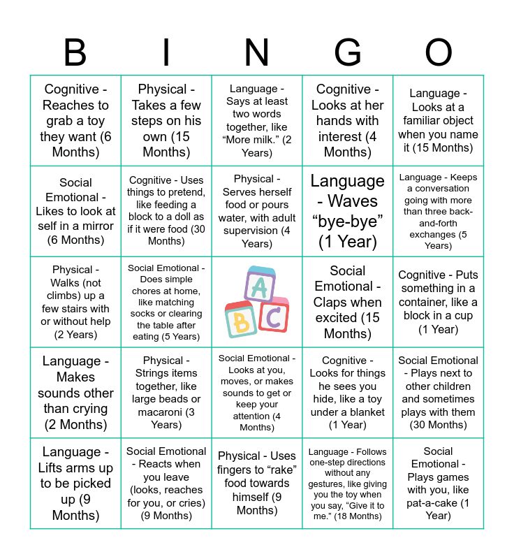 This bingo card has a free space and 54 words: Social Emotional - Smiles when you talk to or smile at her (2 Months), Language - Makes sounds other than crying (2 Months), Cognitive - Watches you as you move (2 Months), Physical - Holds head up when on tummy (2 Months), Social Emotional - Looks at you, moves, or makes sounds to get or keep your attention (4 Months), Language - Makes sounds back when you talk to them (4 Months), Cognitive - Looks at her hands with interest (4 Months), Physical - Pushes up onto elbows/forearms when on tummy (4 Months), Social Emotional - Likes to look at self in a mirror (6 Months), Language - Takes turns making sounds with you (6 Months), Cognitive - Reaches to grab a toy they want (6 Months), Physical - Leans on hands to support herself when sitting (6 Months), Social Emotional - Reacts when you leave (looks, reaches for you, or cries) (9 Months), Language - Lifts arms up to be picked up (9 Months), Cognitive - Looks for objects when dropped out of sight (like his spoon or toy) (9 Months), Physical - Uses fingers to “rake” food towards himself (9 Months), Social Emotional - Plays games with you, like pat-a-cake (1 Year), Language - Waves “bye-bye” (1 Year), Language - Calls a parent “mama” or “dada” or another special name (1 Year), Cognitive - Puts something in a container, like a block in a cup (1 Year), Cognitive - Looks for things he sees you hide, like a toy under a blanket (1 Year), Physical - Drinks from a cup without a lid, as you hold it (1 Year), Social Emotional - Claps when excited (15 Months), Language - Looks at a familiar object when you name it (15 Months), Cognitive - Tries to use things the right way, like a phone, cup, or book (15 Months), Physical - Takes a few steps on his own (15 Months), Physical - Uses fingers to feed herself some food (15 Months), Social Emotional - Points to show you something interesting (18 Months), Language - Tries to say three or more words besides “mama” or “dada” (18 Months), Language - Follows one-step directions without any gestures, like giving you the toy when you say, “Give it to me.” (18 Months), Cognitive - Copies you doing chores, like sweeping with a broom (18 Months), Physical - Walks without holding on to anyone or anything (18 Months), Physical - Scribbles(18 Months), Social Emotional - Looks at your face to see how to react in a new situation (2 Years), Language - Says at least two words together, like “More milk.” (2 Years), Cognitive - Plays with more than one toy at the same time, like putting toy food on a toy plate (2 Years), Physical - Walks (not climbs) up a few stairs with or without help (2 Years), Social Emotional - Plays next to other children and sometimes plays with them (30 Months), Language - Says about 50 words (30 Months), Cognitive - Uses things to pretend, like feeding a block to a doll as if it were food (30 Months), Physical - Turns book pages, one at a time, when you read to them (30 Months), Social Emotional - Calms down within 10 minutes after you leave her, like at a childcare drop off ( 3 Years), Language - Says first name, when asked (3 Years), Cognitive - Draws a circle, when you show him how (3 Years), Physical - Strings items together, like large beads or macaroni (3 Years), Social Emotional - Comforts others who are hurt or sad, like hugging a crying friend (4 Years), Language - Says some words from a song, story, or nursery rhyme (4 Years), Cognitive - Names a few colors of items (4 Years), Physical - Serves herself food or pours water, with adult supervision (4 Years), Social Emotional - Does simple chores at home, like matching socks or clearing the table after eating (5 Years), Language - Keeps a conversation going with more than three back-and-forth exchanges (5 Years), Cognitive - Pays attention for 5 to 10 minutes during activities. For example, during story time or making arts and crafts (screen time does not count) (5 Years), Physical - Hops on one foot (5 Years) and Social Emotional - Copies other children while playing, like taking toys out of a container when another child does (15 Months).