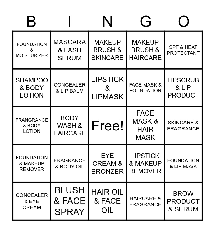 This bingo card has a free space and 24 words: FRAGRANCE & BODY OIL, BLUSH & FACE SPRAY, LIPSTICK & LIPMASK, CONCEALER & EYE CREAM, SPF & HEAT PROTECTANT, FOUNDATION & MOISTURIZER, SHAMPOO & BODY LOTION, MASCARA & LASH SERUM, FACE MASK & HAIR MASK, EYE CREAM & BRONZER, FACE MASK & FOUNDATION, FRANGRANCE & BODY LOTION, LIPSTICK & MAKEUP REMOVER, FOUNDATION & LIP MASK, CONCEALER & LIP BALM, HAIRCARE & FRAGRANCE, SKINCARE & FRAGRANCE, MAKEUP BRUSH & SKINCARE, LIPSCRUB & LIP PRODUCT, BODY WASH & HAIRCARE, BROW PRODUCT & SERUM, FOUNDATION & MAKEUP REMOVER, MAKEUP BRUSH & HAIRCARE and HAIR OIL & FACE OIL.