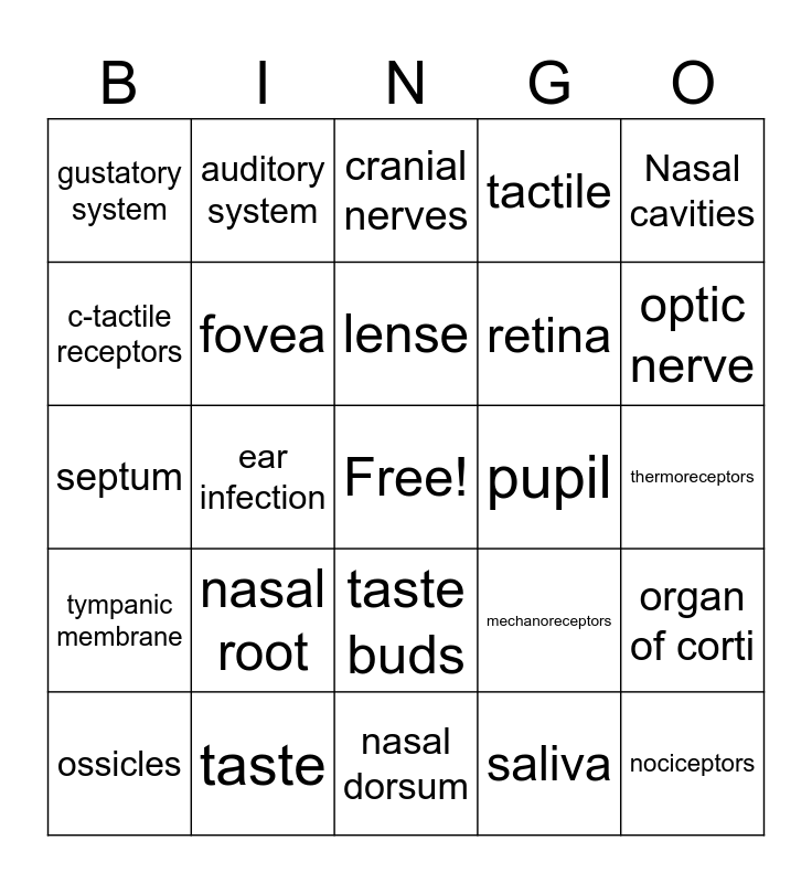 This bingo card has a free space and 24 words: nasal root, taste, lense, ossicles, Nasal cavities, gustatory system, c-tactile receptors, auditory system, pupil, taste buds, retina, septum, mechanoreceptors, organ of corti, fovea, saliva, thermoreceptors, cranial nerves, optic nerve, ear infection, nociceptors, tympanic membrane, tactile and nasal dorsum.