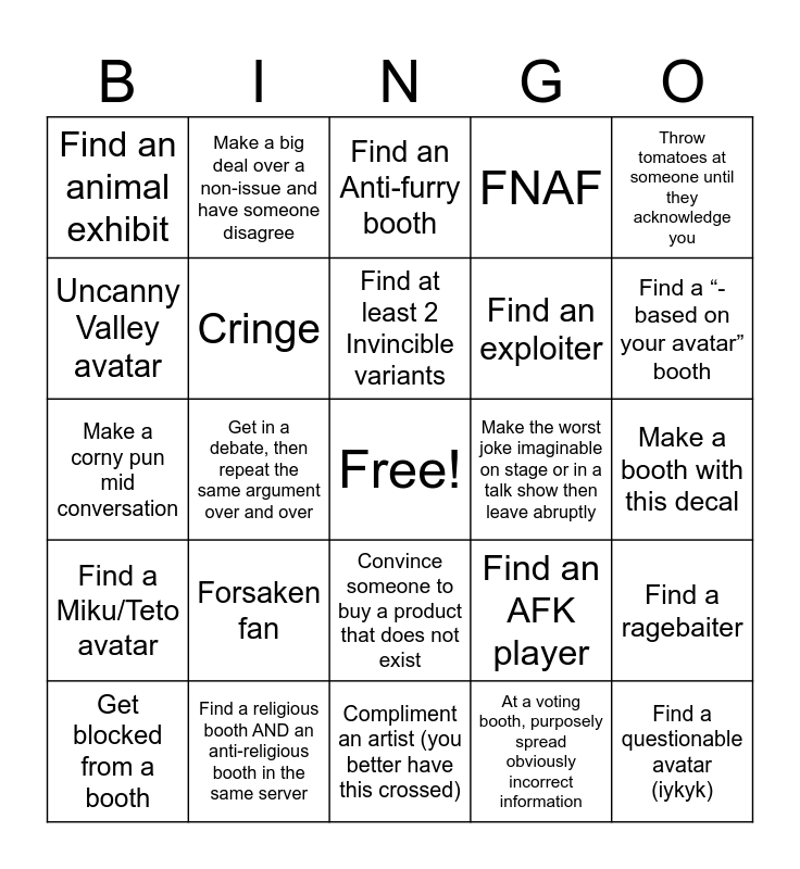 This bingo card has a free space and 24 words: Forsaken fan, Find a religious booth AND an anti-religious booth in the same server, Find at least 2 Invincible variants, Get blocked from a booth, Throw tomatoes at someone until they acknowledge you, Find an animal exhibit, Uncanny Valley avatar, Make a big deal over a non-issue and have someone disagree, Make the worst joke imaginable on stage or in a talk show then leave abruptly, Convince someone to buy a product that does not exist, Find an exploiter, Make a corny pun mid conversation, Find an AFK player, Find a ragebaiter, Cringe, At a voting booth, purposely spread obviously incorrect information, Make a booth with this decal, Find an Anti-furry booth, Find a “-based on your avatar” booth, Get in a debate, then repeat the same argument over and over, Find a questionable avatar (iykyk), Find a Miku/Teto avatar, FNAF and Compliment an artist (you better have this crossed).