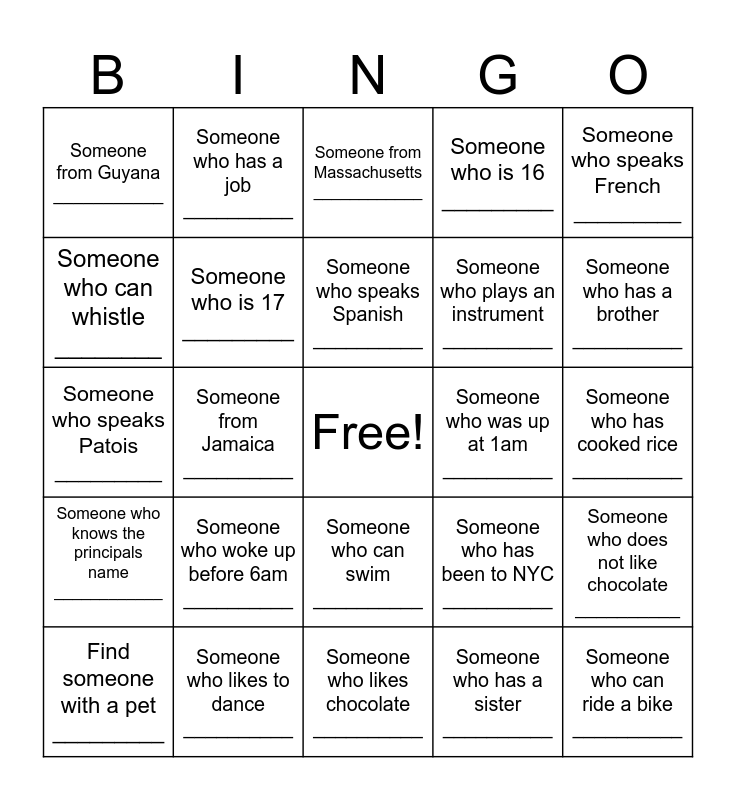 This bingo card has a free space and 29 words: Find someone with a pet _________, Someone who likes pizza __________, Someone from Jamaica __________, Someone from Haiti _________, Someone from Guyana ___________, Someone from Massachusetts ____________, Someone who is 17 _________, Someone who woke up before 6am __________, Someone who was up at 1am __________, Someone who likes to dance __________, Someone who has cooked rice __________, Someone who can ride a bike __________, Someone who likes chocolate __________, Someone who has a sister __________, Someone who has a brother __________, Someone who likes math __________, Someone who can swim __________, Someone who knows the principals name ____________, Someone who speaks French _________, Someone who speaks Patois _________, Someone who has been to NYC __________, Someone who has been to California _________, Someone who plays an instrument __________, Someone who can whistle ________, Someone who is 16 _________, Someone who has a job __________, Someone who does not like chocolate __________, Someone who speaks Spanish __________ and Someone who can snap _________.