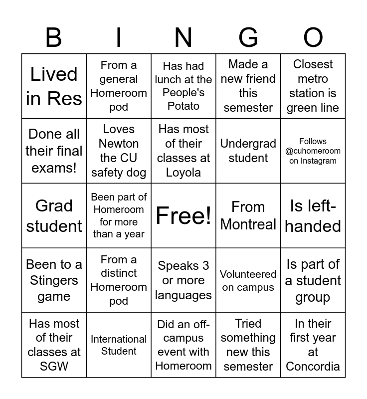 This bingo card has a free space and 24 words: From a distinct Homeroom pod, International Student, Has most of their classes at Loyola, Has most of their classes at SGW, Closest metro station is green line, Lived in Res, Done all their final exams!, From a general Homeroom pod, From Montreal, Speaks 3 or more languages, Undergrad student, Grad student, Volunteered on campus, Is part of a student group, Loves Newton the CU safety dog, Tried something new this semester, Is left-handed, Has had lunch at the People's Potato, Follows @cuhomeroom on Instagram, Been part of Homeroom for more than a year, In their first year at Concordia, Been to a Stingers game, Made a new friend this semester and Did an off-campus event with Homeroom.