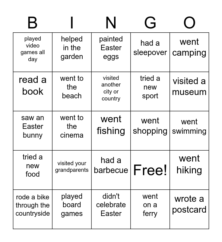 This bingo card has 25 words: visited your grandparents, didn't celebrate Easter, visited another city or country, rode a bike through the countryside, went camping, played video games all day, read a book, helped in the garden, went shopping, had a barbecue, tried a new sport, saw an Easter bunny, Free!, went hiking, went to the beach, wrote a postcard, went swimming, painted Easter eggs, visited a museum, went to the cinema, went fishing, played board games, tried a new food, had a sleepover and went on a ferry.