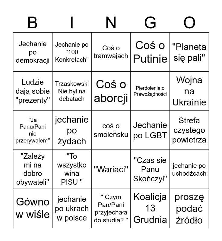 This bingo card has 25 words: ''To wszystko wina PISU '', '' Czym Pan/Pani przyjechała do studia? '', Coś o aborcji, Gówno w wiśle, ''Planeta się pali'', Jechanie po demokracji, Ludzie dają sobie ''prezenty'', Jechanie po ''100 Konkretach'', Jechanie po LGBT, ''Wariaci'', Pierdolenie o Prawożądności, ''Ja Panu/Pani nie przerywałem'', ''Czas sie Panu Skończył'', jechanie po uchodźcach, Trzaskowski Nie był na debatach, proszę podać źródło, Strefa czystego powietrza, Coś o tramwajach, Wojna na Ukrainie, jechanie po żydach, coś o smoleńsku, jechanie po ukrach w polsce, ''Zależy mi na dobro obywateli'', Coś o Putinie and Koalicja 13 Grudnia.