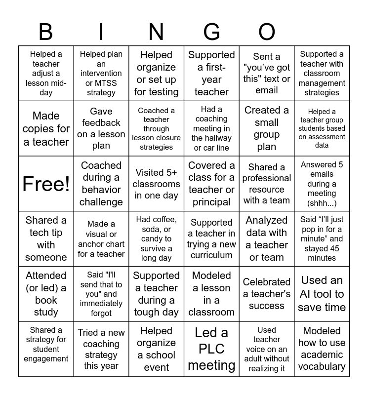 This bingo card has 36 words: Modeled a lesson in a classroom, Supported a teacher during a tough day, Led a PLC meeting, Made copies for a teacher, Shared a tech tip with someone, Covered a class for a teacher or principal, Gave feedback on a lesson plan, Helped organize a school event, Sent a "you’ve got this" text or email, Celebrated a teacher's success, Helped a teacher group students based on assessment data, Supported a first-year teacher, Used an AI tool to save time, Coached during a behavior challenge, Had a coaching meeting in the hallway or car line, Helped a teacher adjust a lesson mid-day, Attended (or led) a book study, Shared a professional resource with a team, Free!, Helped organize or set up for testing, Visited 5+ classrooms in one day, Made a visual or anchor chart for a teacher, Supported a teacher in trying a new curriculum, Had coffee, soda, or candy to survive a long day, Analyzed data with a teacher or team, Helped plan an intervention or MTSS strategy, Created a small group plan, Tried a new coaching strategy this year, Coached a teacher through lesson closure strategies, Supported a teacher with classroom management strategies, Modeled how to use academic vocabulary, Shared a strategy for student engagement, Said “I’ll just pop in for a minute” and stayed 45 minutes, Answered 5 emails during a meeting (shhh...), Said "I'll send that to you" and immediately forgot and Used teacher voice on an adult without realizing it.