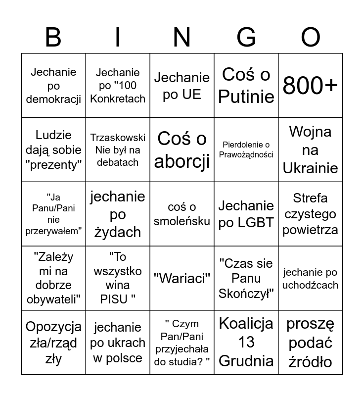 This bingo card has 25 words: ''To wszystko wina PISU '', '' Czym Pan/Pani przyjechała do studia? '', Coś o aborcji, Opozycja zła/rząd zły, 800+, Jechanie po demokracji, Ludzie dają sobie ''prezenty'', Jechanie po ''100 Konkretach, Jechanie po LGBT, ''Wariaci'', Pierdolenie o Prawożądności, ''Ja Panu/Pani nie przerywałem'', ''Czas sie Panu Skończył'', jechanie po uchodźcach, Trzaskowski Nie był na debatach, proszę podać źródło, Strefa czystego powietrza, Jechanie po UE, Wojna na Ukrainie, jechanie po żydach, coś o smoleńsku, jechanie po ukrach w polsce, ''Zależy mi na dobrze obywateli'', Coś o Putinie and Koalicja 13 Grudnia.