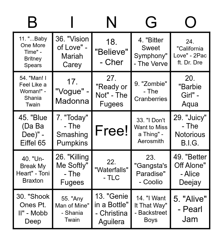 This bingo card has a free space and 55 words: 1. "Smells Like Teen Spirit" - Nirvana, 2. "Black Hole Sun" - Soundgarden, 3. "Wonderwall" - Oasis, 4. "Bitter Sweet Symphony" - The Verve, 5. "Alive" - Pearl Jam, 6. "Jeremy" - Pearl Jam, 7. "Today" - The Smashing Pumpkins, 8. "Interstate Love Song" - Stone Temple Pilots, 9. "Zombie" - The Cranberries, 10. "Plush" - Stone Temple Pilots, 11. "...Baby One More Time" - Britney Spears, 12. "Waterfalls" - TLC, 13. "Genie in a Bottle" - Christina Aguilera, 14. "I Want It That Way" - Backstreet Boys, 15. "Livin' La Vida Loca" - Ricky Martin, 16. "Quit Playing Games (With My Heart)" - Backstreet Boys, 17. "Vogue" - Madonna, 18. "Believe" - Cher, 19. "Macarena" - Los del Río, 20. "Barbie Girl" - Aqua, 21. "No Diggity" - Blackstreet ft. Dr. Dre, 22. "Waterfalls" - TLC, 23. "Gangsta's Paradise" - Coolio, 24. "California Love" - 2Pac ft. Dr. Dre, 25. "Nuthin' But a 'G' Thang" - Dr. Dre, 26. "Killing Me Softly" - The Fugees, 27. "Ready or Not" - The Fugees, 28. "Gin and Juice" - Snoop Dogg, 29. "Juicy" - The Notorious B.I.G., 30. "Shook Ones Pt. II" - Mobb Deep, 31. "I Will Always Love You" - Whitney Houston, 51. "Achy Breaky Heart" - Billy Ray Cyrus, 52. "Friends in Low Places" - Garth Brooks, 53. "Boot Scootin' Boogie" - Brooks & Dunn, 54. "Man! I Feel Like a Woman!" - Shania Twain, 55. "Any Man of Mine" - Shania Twain, 32. "Truly Madly Deeply" - Savage Garden, 33. "I Don't Want to Miss a Thing" - Aerosmith, 34. "Everything I Do (I Do It for You)" - Bryan Adams, 35. "My Heart Will Go On" - Celine Dion, 36. "Vision of Love" - Mariah Carey, 37. "Hero" - Mariah Carey, 38. "I Swear" - All-4-One, 39. "End of the Road" - Boyz II Men, 40. "Un-Break My Heart" - Toni Braxton, 41. "Groove Is in the Heart" - Deee-Lite, 42. "What Is Love" - Haddaway, 43. "Be My Lover" - La Bouche, 44. "Rhythm Is a Dancer" - Snap!, 45. "Blue (Da Ba Dee)" - Eiffel 65, 46. "Around the World" - Daft Punk, 47. "Pump Up the Jam" - Technotronic, 48. "What Is Love" - Haddaway, 49. "Better Off Alone" - Alice Deejay and 50. "Freed from Desire" - Gala.
