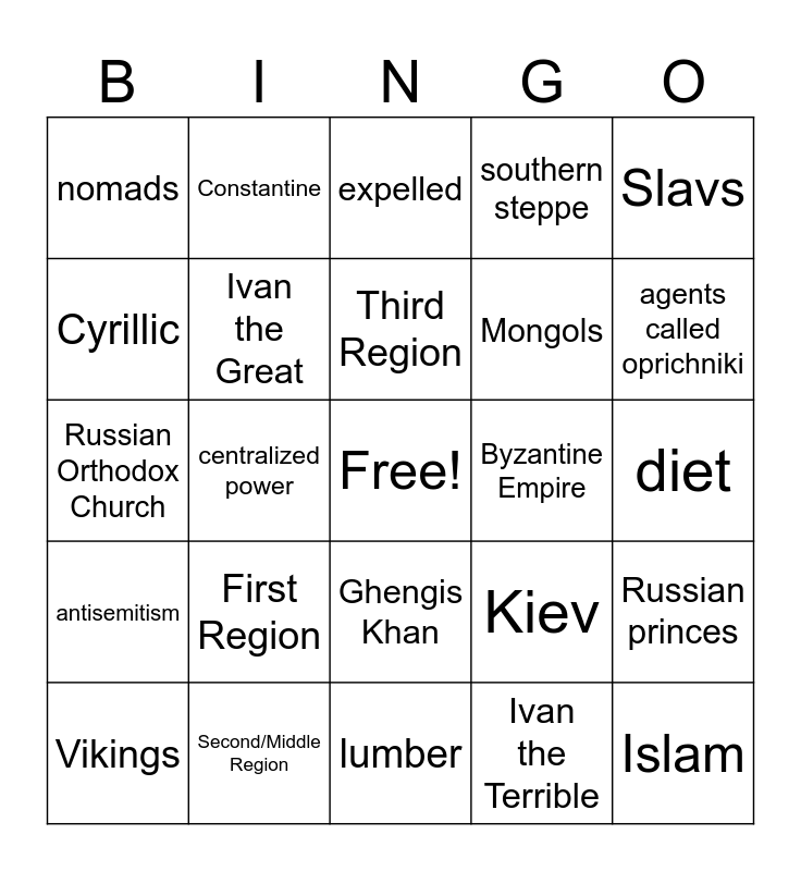 This bingo card has a free space and 24 words: First Region, Second/Middle Region, Third Region, Vikings, Slavs, nomads, Cyrillic, Constantine, Byzantine Empire, Ghengis Khan, Mongols, Russian Orthodox Church, Kiev, Russian princes, Ivan the Great, Ivan the Terrible, diet, expelled, agents called oprichniki, centralized power, Islam, antisemitism, southern steppe and lumber.