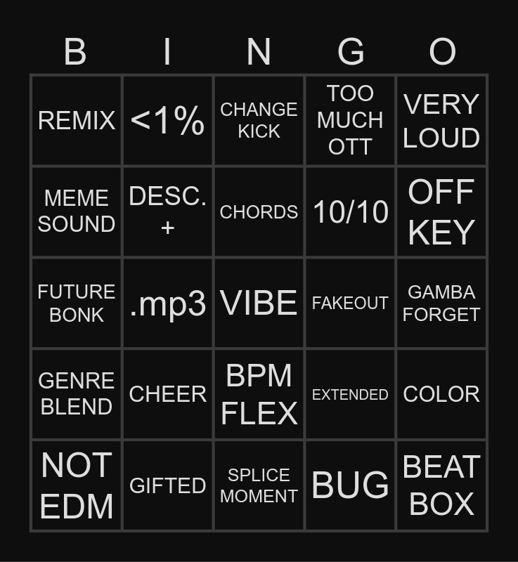 This bingo card has a free space and 24 words: CHEER, GIFTED, CHORDS, NOT EDM, VERY LOUD, REMIX, MEME SOUND, <1%, FAKEOUT, BPM FLEX, 10/10, FUTURE BONK, EXTENDED, COLOR, DESC. +, BUG, GAMBA FORGET, CHANGE KICK, OFF KEY, .mp3, BEAT BOX, GENRE BLEND, TOO MUCH OTT and SPLICE MOMENT.