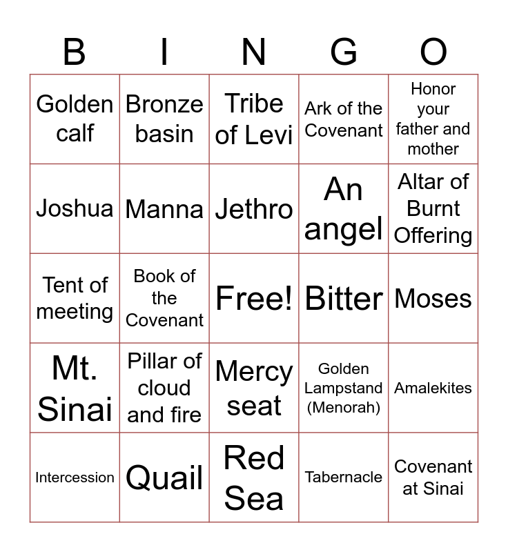 This bingo card has a free space and 24 words: Pillar of cloud and fire, Quail, Jethro, Intercession, Honor your father and mother, Golden calf, Joshua, Bronze basin, Bitter, Mercy seat, An angel, Tent of meeting, Golden Lampstand (Menorah), Amalekites, Manna, Tabernacle, Moses, Tribe of Levi, Altar of Burnt Offering, Book of the Covenant, Covenant at Sinai, Mt. Sinai, Ark of the Covenant and Red Sea.