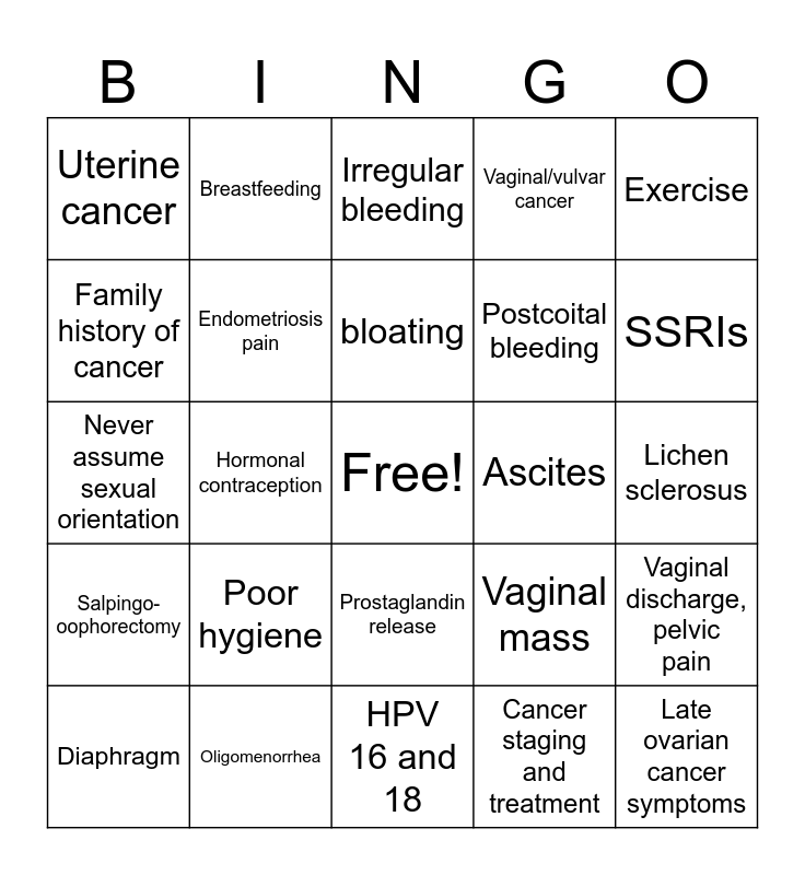 This bingo card has a free space and 90 words: Menopause, Ovulation, Prostaglandin release, TVUS/CT scan, BRCA1 and BRCA2, Teach-back method, Emergency contraception, Primary dysmenorrhea, IUD, Postmenopausal bleeding, HPV vaccination, Abnormal vaginal discharge/bleeding, CA-125, Lichen sclerosus, Decreased estrogen, bloating, ACHES, Heating pad/exercise, Vulvectomy, PMS/PMDD, Fluid retention, cravings, headache, fatigue, Minipill, HPV 16 and 18, Progestins, Levonorgestrel IUD, Never assume sexual orientation, Oligomenorrhea, Cervical cancer, Endometrial biopsy, Vulvar cancer, LARC (IUD, Implant), PAINS signs, Vaginal discharge, pelvic pain, Condom/diaphragm, Salpingo-oophorectomy, Uterine cancer, Vaginal/vulvar cancer, Irregular bleeding, Constipation, Hormonal contraception, SSRIs, Diaphragm, Family history of cancer, Tumor debulking, Copper IUD, Reduced endometrial cancer risk, Vaginal mass, Pap smear, Carboplatin and paclitaxel, Multiparity, Ovarian cancer surgery, Bloating, early satiety, Postcoital bleeding, Cyclic progesterone, Endometrial hyperplasia, Vaginal estrogen, Nonjudgmental communication, Ascites, Gynecologic cancer, Cancer prevention with HPV vaccine, Condom, Fertility awareness methods, Hysterectomy, Ovarian cancer, Liver profile, Platinum chemotherapy, LEEP, HPV vaccine age 9-26, Cancer staging and treatment, Fertility loss, Cervical biopsy, Poor hygiene, Late ovarian cancer symptoms, Weight loss, MRI/PET, Breastfeeding, Endometriosis pain, Fixed uterus, Leg swelling, Progesterone therapy, Natural diuretics, Pain management, Exercise, Cytoreductive surgery, Vulvar biopsy, HPV, PARP inhibitors, Menorrhagia, Infertility risk, Radical hysterectomy and Heating pad, exercise, low salt diet.