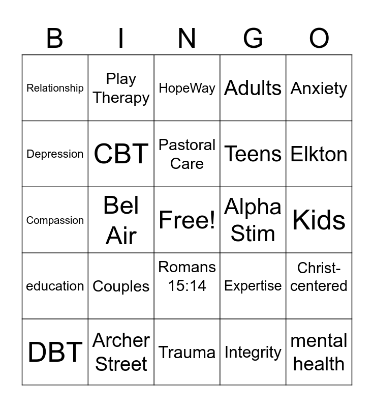 This bingo card has a free space and 24 words: Couples, Archer Street, Pastoral Care, DBT, Anxiety, Relationship, Depression, Play Therapy, Alpha Stim, Romans 15:14, Teens, Compassion, Expertise, Christ-centered, CBT, Integrity, Kids, HopeWay, Elkton, Bel Air, mental health, education, Adults and Trauma.
