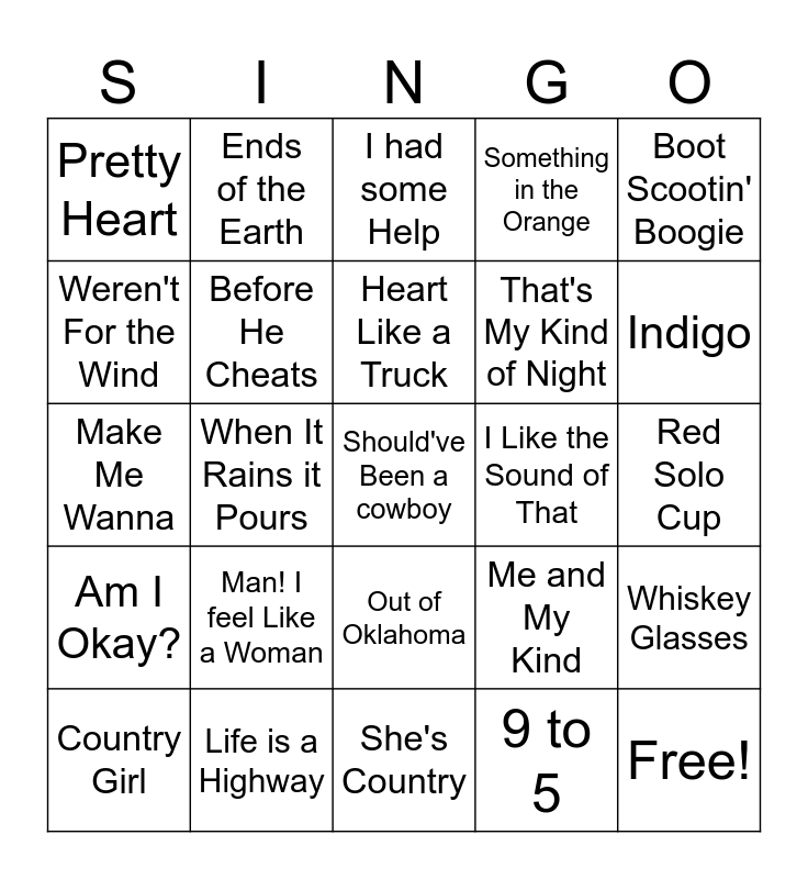 This bingo card has 34 words: Free!, 9 to 5, A Bar Song, Ain't No Love In Oklahoma, Am I Okay?, Before He Cheats, Boot Scootin' Boogie, Country Girl, Ends of the Earth, Friends in Low Places, Heart Like a Truck, I had some Help, I Never Lie, I Had Some Help, I Like the Sound of That, Indigo, Life is a Highway, Make Me Wanna, Man! I feel Like a Woman, Me and My Kind, Out of Oklahoma, Play it Again, Pretty Heart, Red Solo Cup, She's Country, Should've Been a cowboy, Something in the Orange, Tennessee Orange, That's My Kind of Night, Weren't For the Wind, What Kinda Man, When It Rains it Pours, Whiskey Glasses and Worst Way.