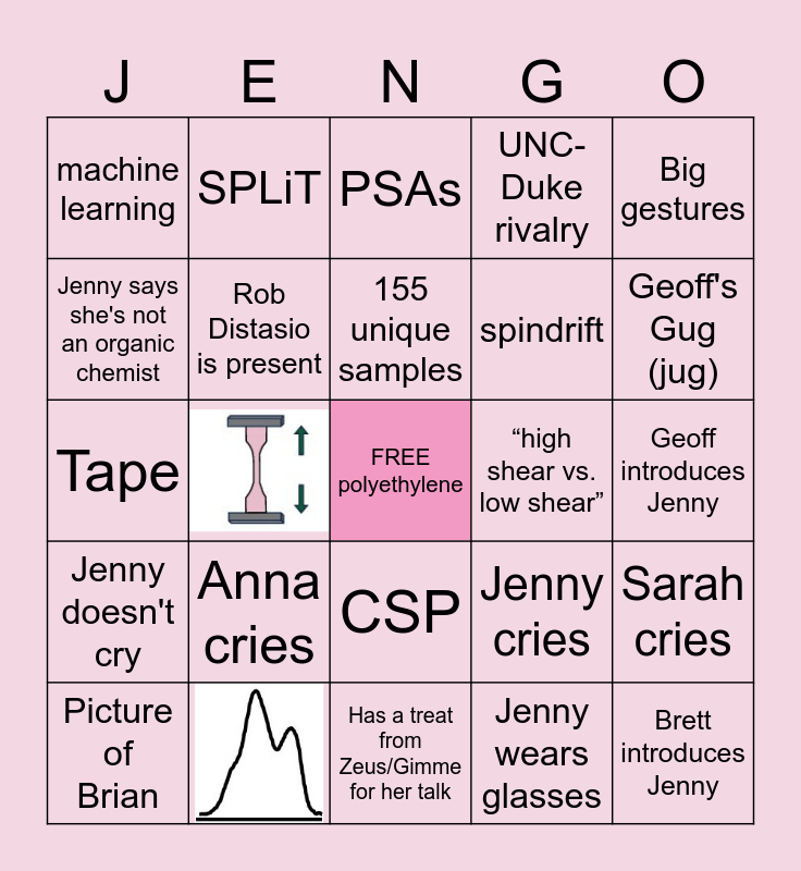 This bingo card has 4 images, a free space and 26 words: machine learning, PSAs, Rob Distasio is present, CSP, “high shear vs. low shear”, Has a treat from Zeus/Gimme for her talk, Geoff introduces Jenny, Brett introduces Jenny, Jenny wears glasses, Jenny doesn't wear glasses, Geoff's Gug (jug), Harry is acknowledged, Jenny cries, Jenny doesn't cry, Anna cries, Big gestures, Tape, Draw casting, SPLiT, spindrift, Jenny says she's not an organic chemist, UNC-Duke rivalry, Sarah cries, Picture of Brian, 155 unique samples and Big pile of plastic waste.