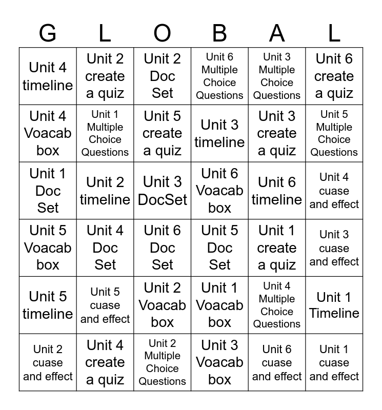 This bingo card has 36 words: Unit 1 Voacab box, Unit 2 Voacab box, Unit 3 Voacab box, Unit 4 Voacab box, Unit 5 Voacab box, Unit 6 Voacab box, Unit 1 Multiple Choice Questions, Unit 2 Multiple Choice Questions, Unit 3 Multiple Choice Questions, Unit 4 Multiple Choice Questions, Unit 5 Multiple Choice Questions, Unit 6 Multiple Choice Questions, Unit 1 Timeline, Unit 2 timeline, Unit 3 timeline, Unit 4 timeline, Unit 5 timeline, Unit 6 timeline, Unit 1 Doc Set, Unit 2 Doc Set, Unit 3 DocSet, Unit 4 Doc Set, Unit 5 Doc Set, Unit 6 Doc Set, Unit 1 create a quiz, Unit 2 create a quiz, Unit 3 create a quiz, Unit 4 create a quiz, Unit 5 create a quiz, Unit 6 create a quiz, Unit 1 cuase and effect, Unit 2 cuase and effect, Unit 3 cuase and effect, Unit 4 cuase and effect, Unit 5 cuase and effect and Unit 6 cuase and effect.