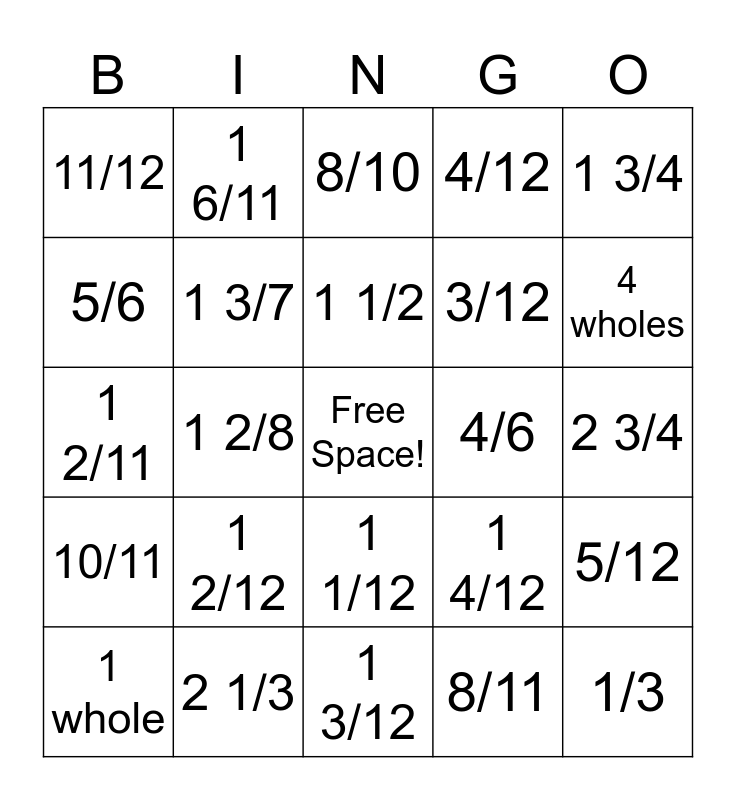 This bingo card has a free space and 29 words: 1 whole, 1 1/4, 1 2/8, 1 3/6, 11/12, 8/10, 1 3/7, 1 2/12, 4/6, 2 1/3, 2 3/4, 1/3, 1 3/12, 8/11, 4 wholes, 1 2/6, 1 1/12, 10/11, 1 3/4, 1 2/11, 1 4/12, 9/12, 3/12, 5/6, 4/12, 1 6/11, 5/12, 1 1/2 and 1/3.